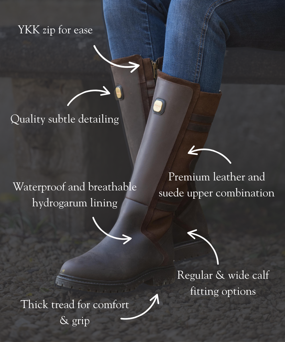 Rich brown leather with subtle tonal detailing is complemented by a classic gold buckle and Toggi logo on the upper for a premium country aesthetic. In addition to the regular and wide calf fitting options, the width can be adjusted further with the leather strap to tailor the fit.
